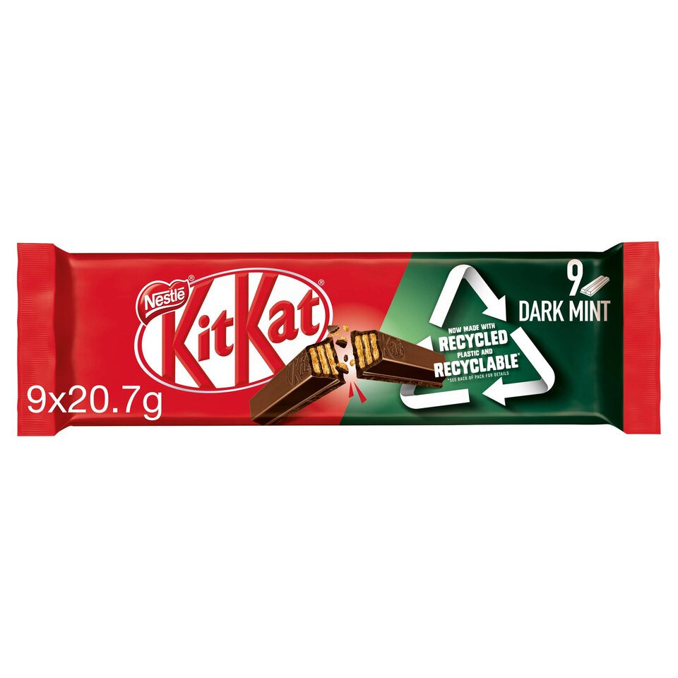 Nine bars of two crispy wafer fingers covered with mint flavoured dark chocolate (66%).