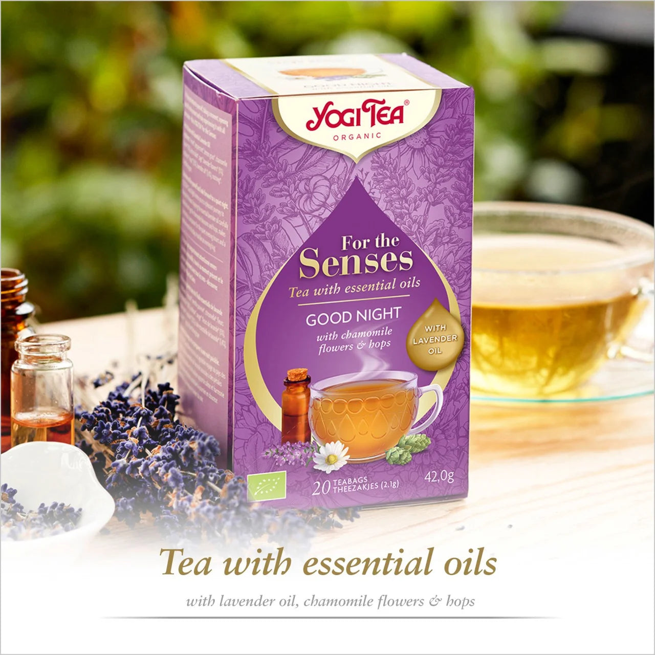 Yogi Tea® Good Night with high-quality essential lavender oil, chamomile blossom and hops allows us to consciously enjoy the quiet evening hours and the end of the day.